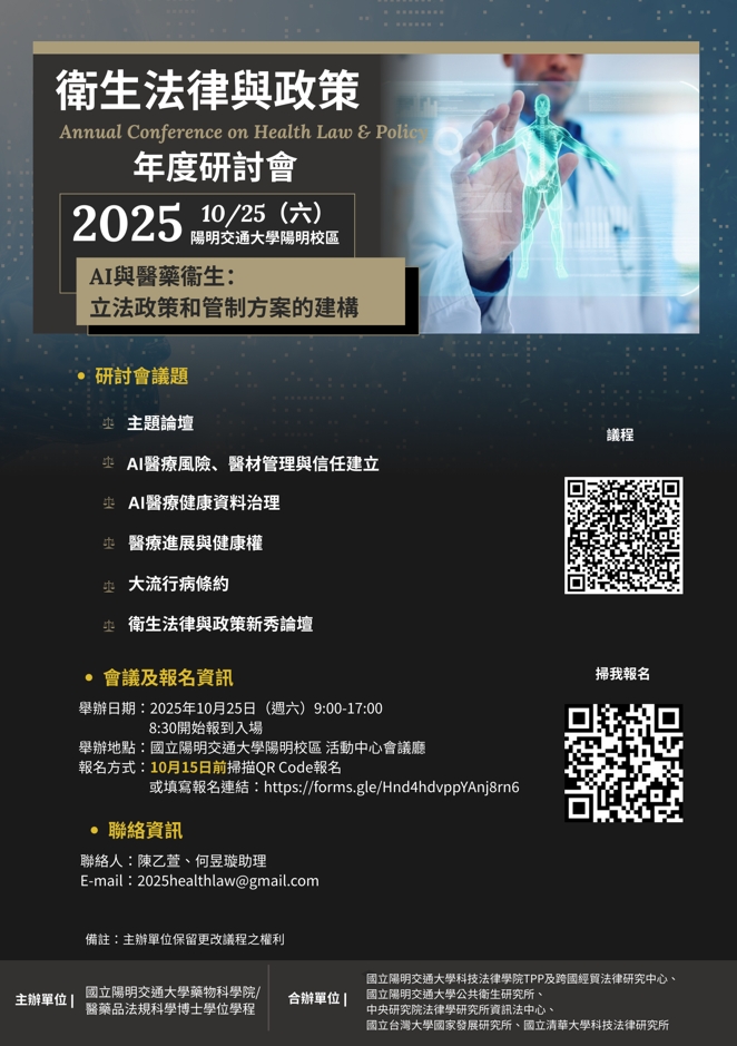 一、本校藥物科學院將於2025年10月25日(星期六)9:00-17:00 舉辦「2025衛生法律與政策年度研討會」,年度主題為 【AI與醫藥衛生—立法政策和管制方案的建構】,地點: 陽明校區活動中心會議廳。