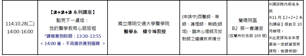謹提供陽明交通大學附設醫院114年10月份最新課程訊息,歡迎宜蘭醫界的朋友們踴躍報名參加。