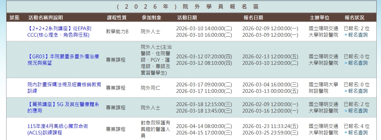 以上課程欲報名參加者請至陽明交通大學附設醫院官網首頁-訊息專區-教學活動訊息<2026院外學員報名區>。