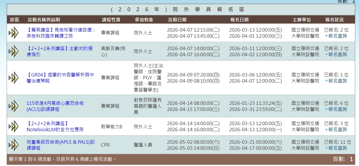 以上課程欲報名參加者請至陽明交通大學附設醫院官網首頁-訊息專區-教學活動訊息<2026院外學員報名區>。