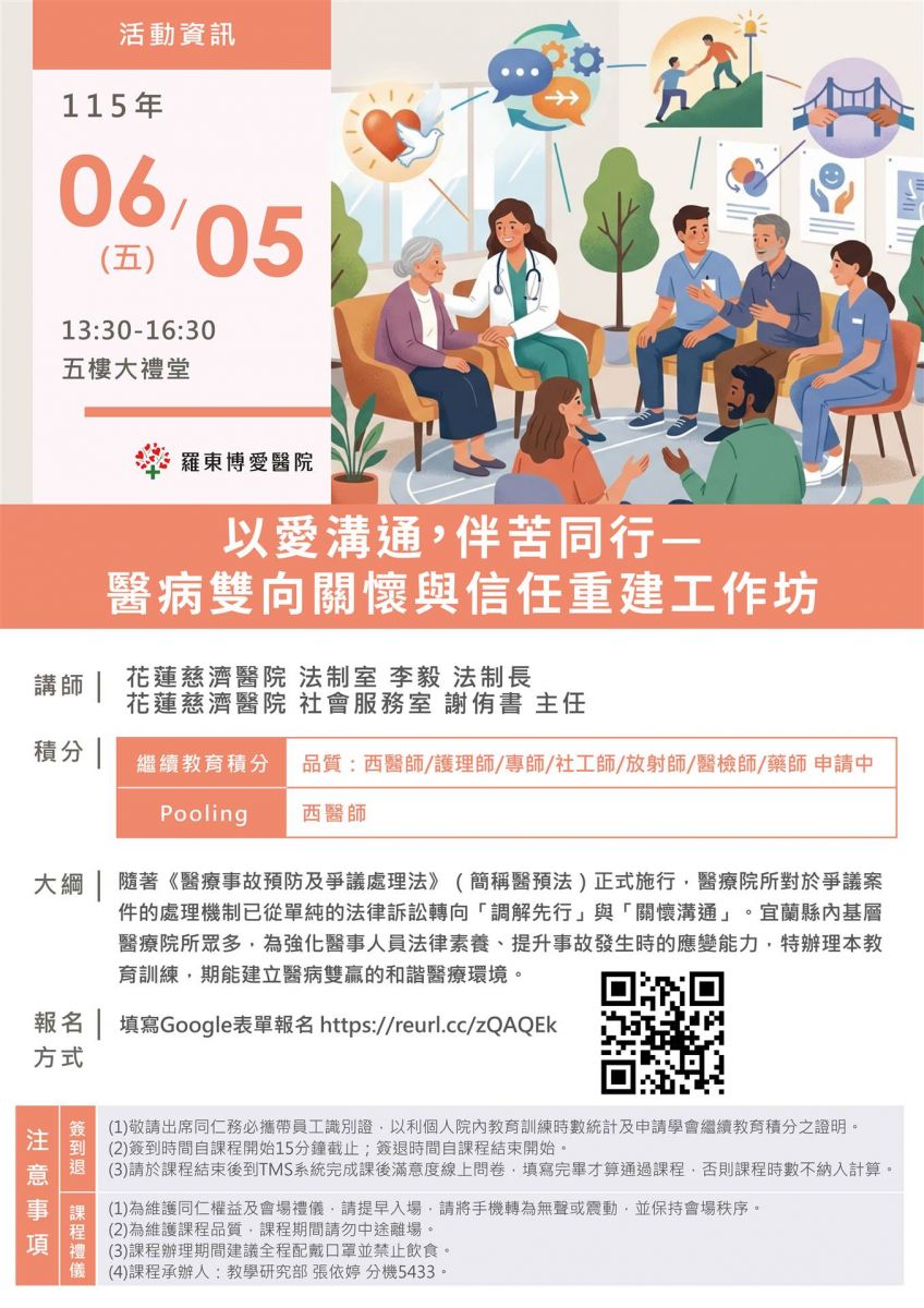 主旨:本院訂於115年6月5日舉辦以愛溝通,伴苦同行—醫病雙 向關懷與信任重建工作坊,請轉知所屬課程訊息,請查 照。